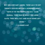 But his servant asked, "How am I to set twenty loaves before a hundred men?" "Give it to the people to eat," said Elisha, "for this is what the LORD says: 'They will eat and have some left over.'"
