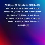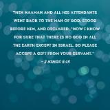 Then Naaman and all his attendants went back to the man of God, stood before him, and declared, "Now I know for sure that there is no God in all the earth except in Israel. So please accept a gift from your servant."