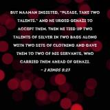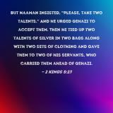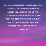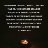 Pictures and Artwork But Naaman insisted, "Please, take two talents." And he urged Gehazi to accept them. Then he tied up two talents of silver in two bags along with two sets of clothing and gave them to two of his servants, who carried them ahead of Gehazi. |