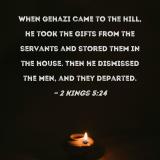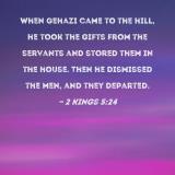 When Gehazi came to the hill, he took the gifts from the servants and stored them in the house. Then he dismissed the men, and they departed.