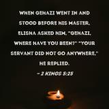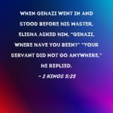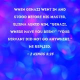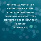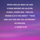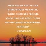 When Gehazi went in and stood before his master, Elisha asked him, "Gehazi, where have you been?" "Your servant did not go anywhere," he replied.