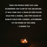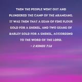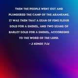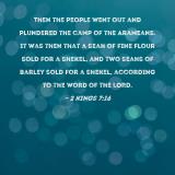 Then the people went out and plundered the camp of the Arameans. It was then that a seah of fine flour sold for a shekel, and two seahs of barley sold for a shekel, according to the word of the LORD.