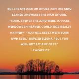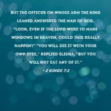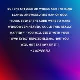 Pictures and Artwork But the officer on whose arm the king leaned answered the man of God, "Look, even if the LORD were to make windows in heaven, could this really happen?" "You will see it with your own eyes," replied Elisha, "but you will not eat any of it." |