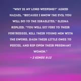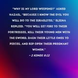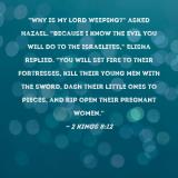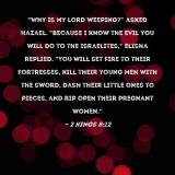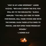 Pictures and Artwork "Why is my lord weeping?" asked Hazael. "Because I know the evil you will do to the Israelites," Elisha replied. "You will set fire to their fortresses, kill their young men with the sword, dash their little ones to pieces, and rip open their pregnant women." |