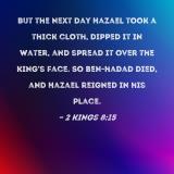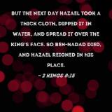 But the next day Hazael took a thick cloth, dipped it in water, and spread it over the king's face. So Ben-hadad died, and Hazael reigned in his place.