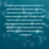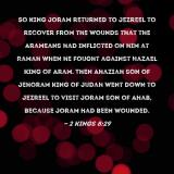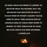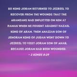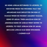 Pictures and Artwork So King Joram returned to Jezreel to recover from the wounds that the Arameans had inflicted on him at Ramah when he fought against Hazael king of Aram. Then Ahaziah son of Jehoram king of Judah went down to Jezreel to visit Joram son of Ahab, because Joram had been wounded. |