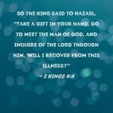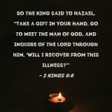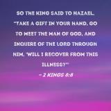 So the king said to Hazael, "Take a gift in your hand, go to meet the man of God, and inquire of the LORD through him, 'Will I recover from this illness?'"