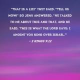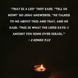 "That is a lie!" they said. "Tell us now!" So Jehu answered, "He talked to me about this and that, and he said, 'This is what the LORD says: I anoint you king over Israel.'"