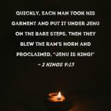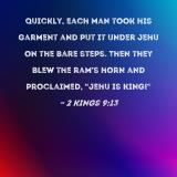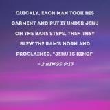 Quickly, each man took his garment and put it under Jehu on the bare steps. Then they blew the ram's horn and proclaimed, "Jehu is king!"