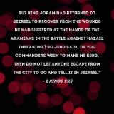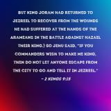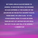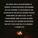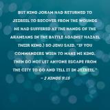 Pictures and Artwork but King Joram had returned to Jezreel to recover from the wounds he had suffered at the hands of the Arameans in the battle against Hazael their king.) So Jehu said, "If you commanders wish to make me king, then do not let anyone escape from the city to go and tell it in Jezreel." |