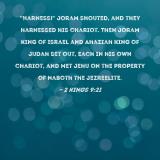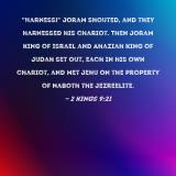 "Harness!" Joram shouted, and they harnessed his chariot. Then Joram king of Israel and Ahaziah king of Judah set out, each in his own chariot, and met Jehu on the property of Naboth the Jezreelite.