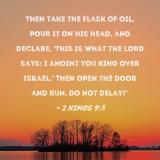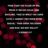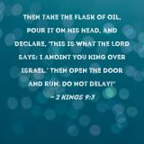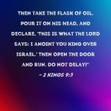 Then take the flask of oil, pour it on his head, and declare, 'This is what the LORD says: I anoint you king over Israel.' Then open the door and run. Do not delay!"