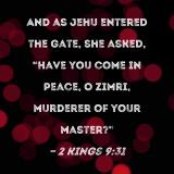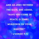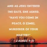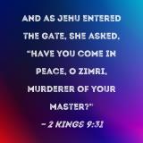 And as Jehu entered the gate, she asked, "Have you come in peace, O Zimri, murderer of your master?"