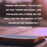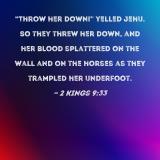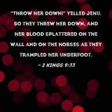 "Throw her down!" yelled Jehu. So they threw her down, and her blood splattered on the wall and on the horses as they trampled her underfoot.