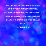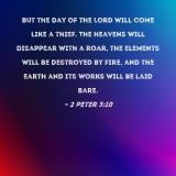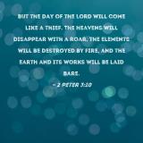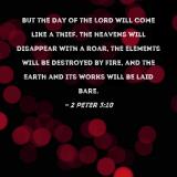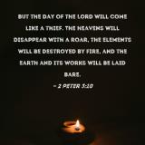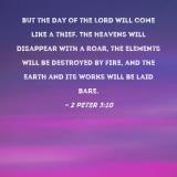But the Day of the Lord will come like a thief. The heavens will disappear with a roar, the elements will be destroyed by fire, and the earth and its works will be laid bare.