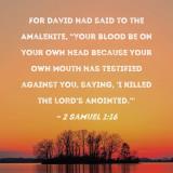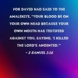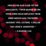 For David had said to the Amalekite, "Your blood be on your own head because your own mouth has testified against you, saying, 'I killed the LORD's anointed.'"