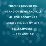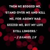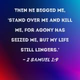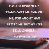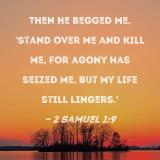 Then he begged me, 'Stand over me and kill me, for agony has seized me, but my life still lingers.'