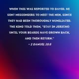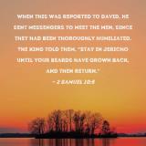 When this was reported to David, he sent messengers to meet the men, since they had been thoroughly humiliated. The king told them, "Stay in Jericho until your beards have grown back, and then return."