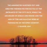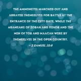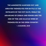 The Ammonites marched out and arrayed themselves for battle at the entrance of the city gate, while the Arameans of Zobah and Rehob and the men of Tob and Maacah were by themselves in the open country.