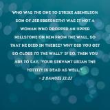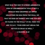 Pictures and Artwork Who was the one to strike Abimelech son of Jerubbesheth? Was it not a woman who dropped an upper millstone on him from the wall, so that he died in Thebez? Why did you get so close to the wall?' If so, then you are to say, 'Your servant Uriah the Hittite is dead as well.'" |
