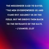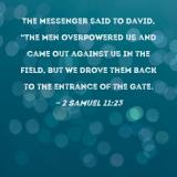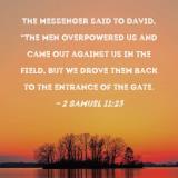 The messenger said to David, "The men overpowered us and came out against us in the field, but we drove them back to the entrance of the gate.
