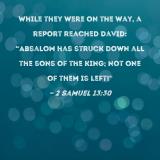 While they were on the way, a report reached David: "Absalom has struck down all the sons of the king; not one of them is left!"