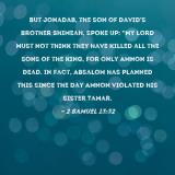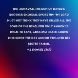 Pictures and Artwork But Jonadab, the son of David's brother Shimeah, spoke up: "My lord must not think they have killed all the sons of the king, for only Amnon is dead. In fact, Absalom has planned this since the day Amnon violated his sister Tamar. |