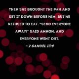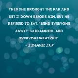 Then she brought the pan and set it down before him, but he refused to eat. "Send everyone away!" said Amnon. And everyone went out.