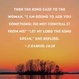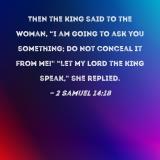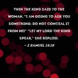 Then the king said to the woman, "I am going to ask you something; do not conceal it from me!" "Let my lord the king speak," she replied.