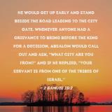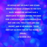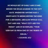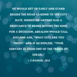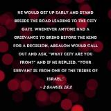 Pictures and Artwork He would get up early and stand beside the road leading to the city gate. Whenever anyone had a grievance to bring before the king for a decision, Absalom would call out and ask, "What city are you from?" And if he replied, "Your servant is from one of the tribes of Israel," |