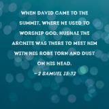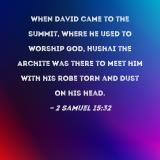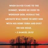When David came to the summit, where he used to worship God, Hushai the Archite was there to meet him with his robe torn and dust on his head.