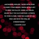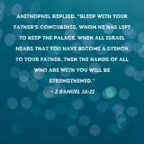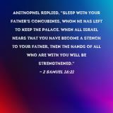 Ahithophel replied, "Sleep with your father's concubines, whom he has left to keep the palace. When all Israel hears that you have become a stench to your father, then the hands of all who are with you will be strengthened."