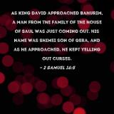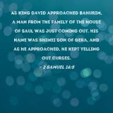 As King David approached Bahurim, a man from the family of the house of Saul was just coming out. His name was Shimei son of Gera, and as he approached, he kept yelling out curses.