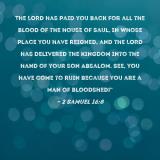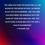 Pictures and Artwork The LORD has paid you back for all the blood of the house of Saul, in whose place you have reigned, and the LORD has delivered the kingdom into the hand of your son Absalom. See, you have come to ruin because you are a man of bloodshed!" |