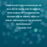 When David came to Mahanaim, he was met by Shobi son of Nahash from Rabbah of the Ammonites, Machir son of Ammiel from Lo-debar, and Barzillai the Gileadite from Rogelim.