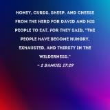 honey, curds, sheep, and cheese from the herd for David and his people to eat. For they said, "The people have become hungry, exhausted, and thirsty in the wilderness."