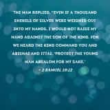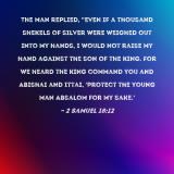 Pictures and Artwork The man replied, "Even if a thousand shekels of silver were weighed out into my hands, I would not raise my hand against the son of the king. For we heard the king command you and Abishai and Ittai, 'Protect the young man Absalom for my sake.' |
