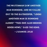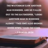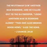 the watchman saw another man running, and he called out to the gatekeeper, "Look! Another man is running alone!" "This one also brings good news," said the king.