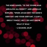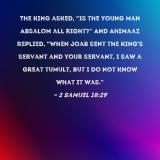 The king asked, "Is the young man Absalom all right?" And Ahimaaz replied, "When Joab sent the king's servant and your servant, I saw a great tumult, but I do not know what it was."