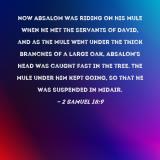 Pictures and Artwork Now Absalom was riding on his mule when he met the servants of David, and as the mule went under the thick branches of a large oak, Absalom's head was caught fast in the tree. The mule under him kept going, so that he was suspended in midair. |