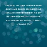 and said, "My lord, do not hold me guilty, and do not remember your servant's wrongdoing on the day my lord the king left Jerusalem. May the king not take it to heart.