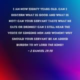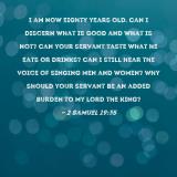 Pictures and Artwork I am now eighty years old. Can I discern what is good and what is not? Can your servant taste what he eats or drinks? Can I still hear the voice of singing men and women? Why should your servant be an added burden to my lord the king? |