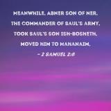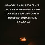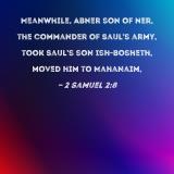 Meanwhile, Abner son of Ner, the commander of Saul's army, took Saul's son Ish-bosheth, moved him to Mahanaim,