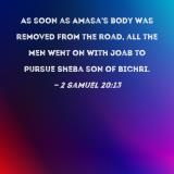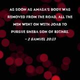 As soon as Amasa's body was removed from the road, all the men went on with Joab to pursue Sheba son of Bichri.