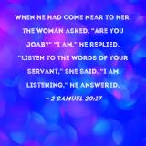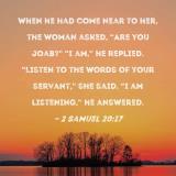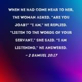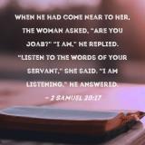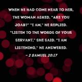 When he had come near to her, the woman asked, "Are you Joab?" "I am," he replied. "Listen to the words of your servant," she said. "I am listening," he answered.