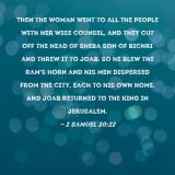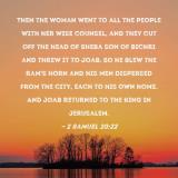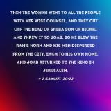 Pictures and Artwork Then the woman went to all the people with her wise counsel, and they cut off the head of Sheba son of Bichri and threw it to Joab. So he blew the ram's horn and his men dispersed from the city, each to his own home. And Joab returned to the king in Jerusalem. |