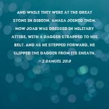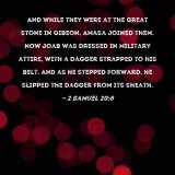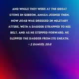 And while they were at the great stone in Gibeon, Amasa joined them. Now Joab was dressed in military attire, with a dagger strapped to his belt. And as he stepped forward, he slipped the dagger from its sheath.