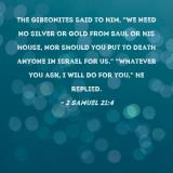 The Gibeonites said to him, "We need no silver or gold from Saul or his house, nor should you put to death anyone in Israel for us." "Whatever you ask, I will do for you," he replied.