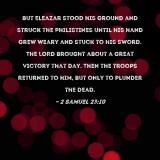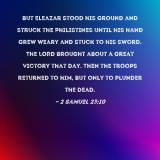 but Eleazar stood his ground and struck the Philistines until his hand grew weary and stuck to his sword. The LORD brought about a great victory that day. Then the troops returned to him, but only to plunder the dead.