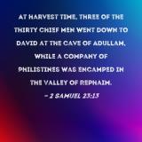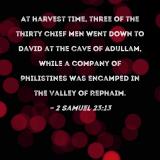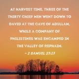 At harvest time, three of the thirty chief men went down to David at the cave of Adullam, while a company of Philistines was encamped in the Valley of Rephaim.
